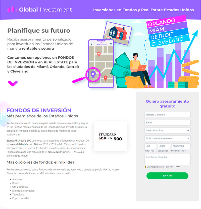 DLC Consulting y AD Interactives se unieron para crear este poderoso servicio de Email Marketing para generar nuevos prospectos y ventas. Global Investment es nuestra unidad de negocio dedicada a promocionar servicios financieros de Fondos de Inversión y Real Estate en los Estados Unidos.